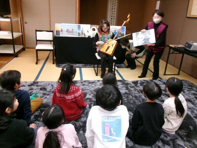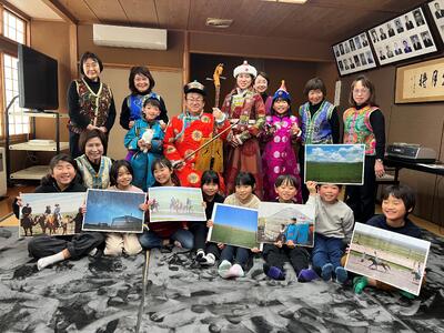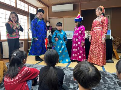 民族衣装や「馬頭琴」の楽器の紹介など、子ども達は目を輝かせて見入っていました。