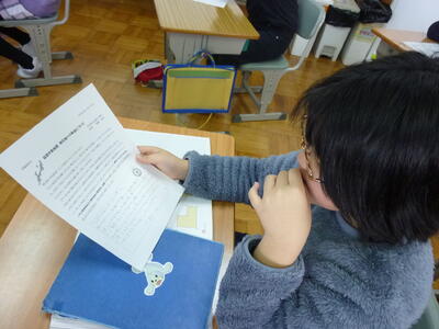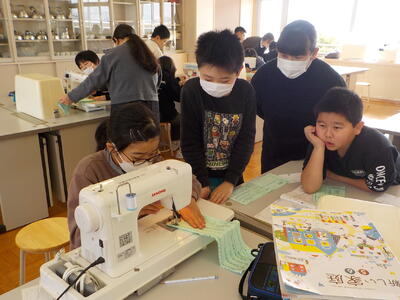 そこで、おうちの方に声がけをしてお手伝いをお願いしました。1月19日には3名のお母さんが来てくださり、糸のかけ方や縫い方を覚えることができました。「あれっ、いいのかな。」「ここから、どうするのかな?」と迷う時に、見守ってくださるお母さんたちが傍にいてくださることで、子どもたちは安心し、しっかりミシンの使い方を覚えました。来週から、ミシンを使って、エプロンづくりをするそうです。お母さん方、お忙しい中ありがとうございました。実際のエプロンづくりでもまたおいでください。