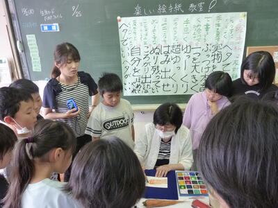 9月25日(月)、4年生が絵手紙を教えていただきました。毎年、永岡レイ子さんをはじめ西里地区の絵手紙教室の方々がご指導くださいます。本日は相澤みち子さん、齋藤綾子さん、和田きぬよさんにお手伝いいただきました。子どもたちは、自分の用意した野菜をじっくり見て、はがきに描いていました。「上手でなくていいんだよ」「好きに書いていいんだよ。」そんな声がけをしていただき、本当にのびのびと描きました。「どんな言葉をそえようか」と真剣に悩む姿もほほえましいものでした。