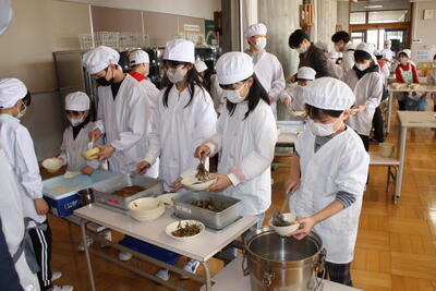 3月13日、今年度最後の給食でした。子どもたちにとって給食は本当に大事なものです。おいしい給食を準備してくださる配膳員さんに感謝の気持ちを伝えました。配膳員さんからも、子どもたちに心のこもったメッセージをいただきました。