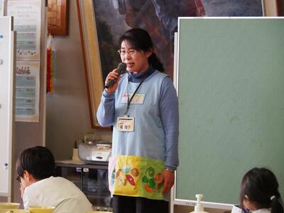 給食センターの栄養教諭、橘綾子先生から給食について、食べ方やマナーなどについてお話もいただきました。