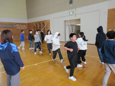 2月20日、元気もりもり委員会主催で「全校なわとび大会」を行いました。学年対抗で、5分間で大なわを何回跳べるか競います。これまで練習を重ねて、各教室の黒板の片隅には「最高記録〇〇〇回!」などと書いてありました。