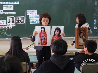 3月11日、約100年前に贈られた「青い目の人形」を見た6年生は、「ちょっと怖い」という感想を口にしました。しかし、平和を願う人形計画と、その後の太平洋戦争中の人形の処遇を知った子どもたちは、人形への印象も変わったようです。戦争中の人形に対する子どもたちの思いを想像する場面では、本当に悩んで考えてくれました。6年生は、授業後も校長室に来て、人形の資料を見ていました。