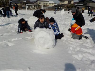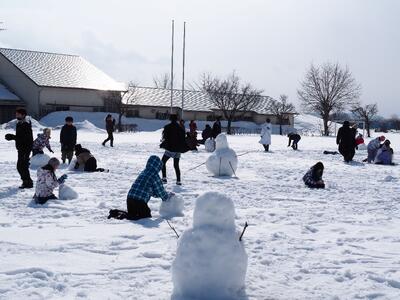 青空のもとで、1~6年生全員で、縦割り班ごとに雪だるまを作って楽しみました。